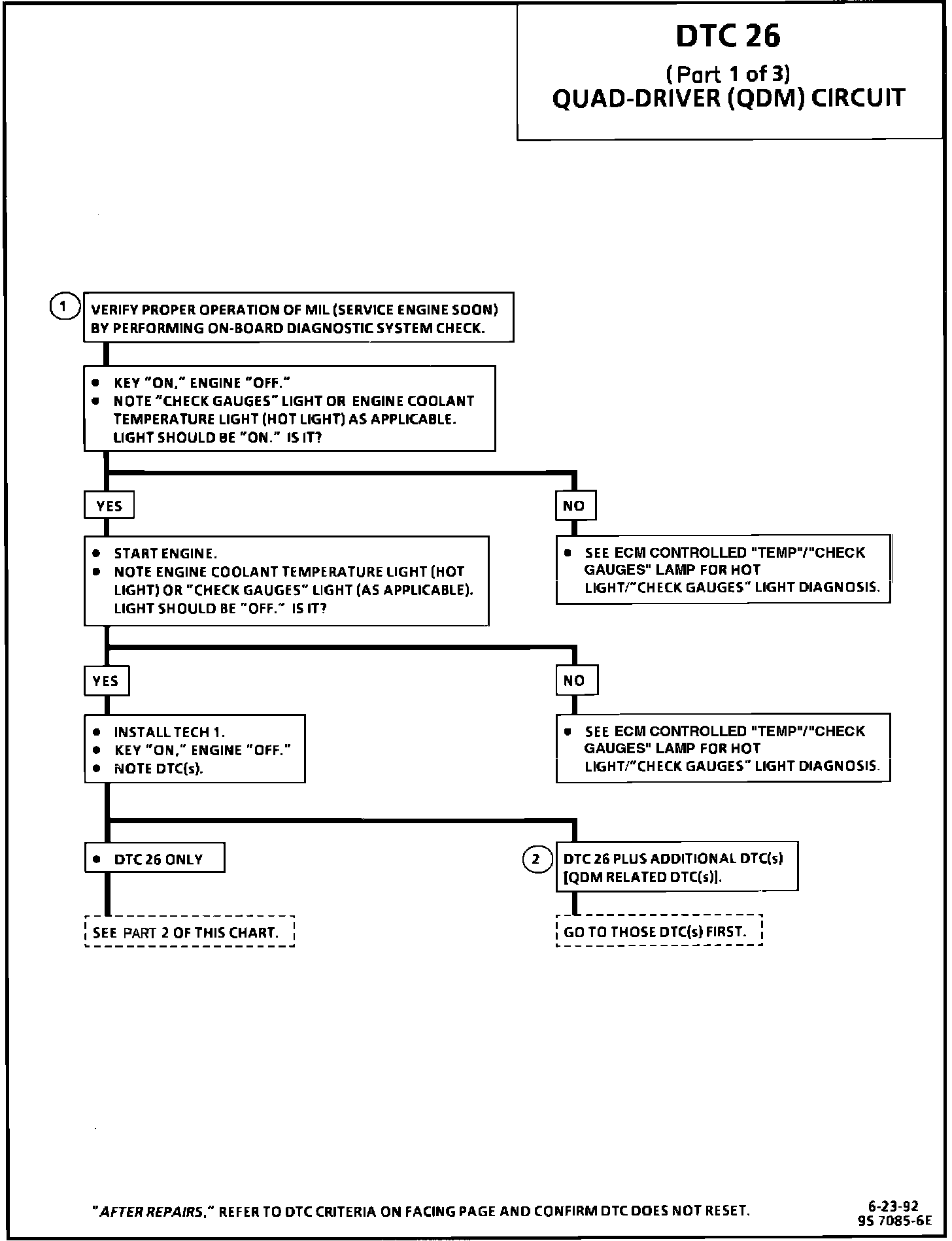 DTC 26 will set when the ECM is commanding a QDM A controlled component "ON" and the voltage potential on the sense line is high, or if the component is commanded "OFF" and the voltage potential on the sense line is low. The fault line, which can be monitored with the Tech 1, will read "HIGH" under these conditions. If the ECM detects a "HIGH" QDM A fault line when it expects a "LOW" one, it will illuminate the MIL (Service Engine Soon) and store DTC 26. QDM B will not set DTC 26.