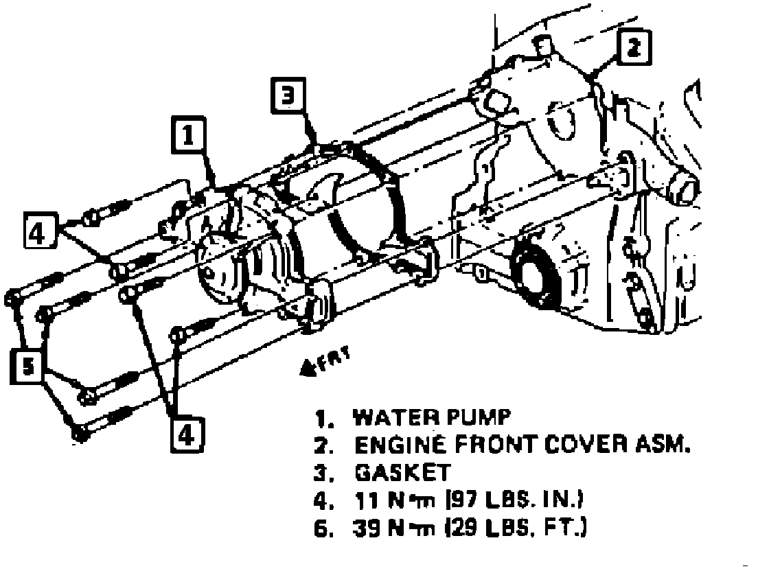 1. Coolant pump and pulley as an assembly, and new gasket. Tighten pump to block bolts to 39 Nm (29 ft lbs) and pump to front cover bolts to 11 Nm (97 in lbs).