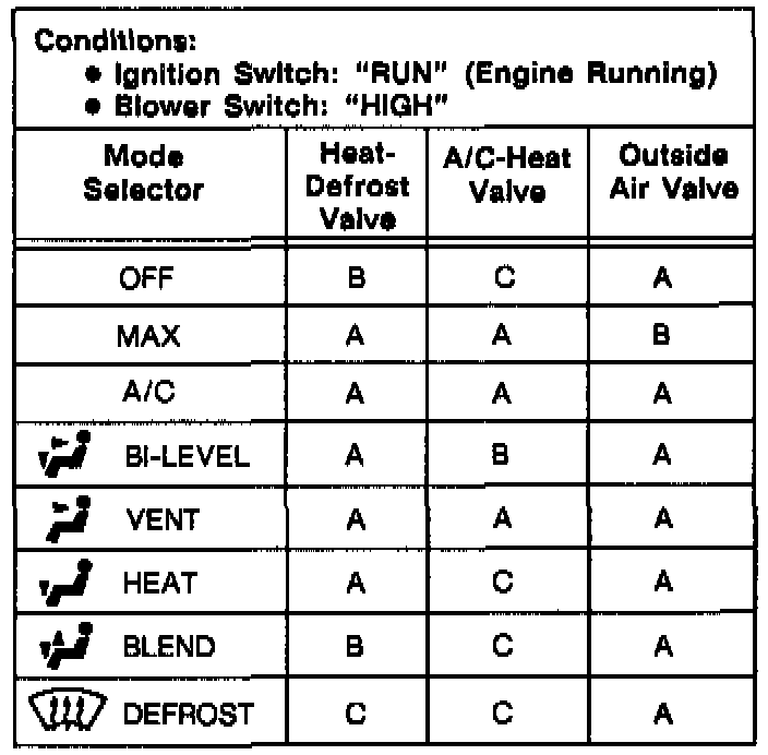 If airflow does not come from the proper outlets under one or more operating models, check the operation of the valves using the chart shown.