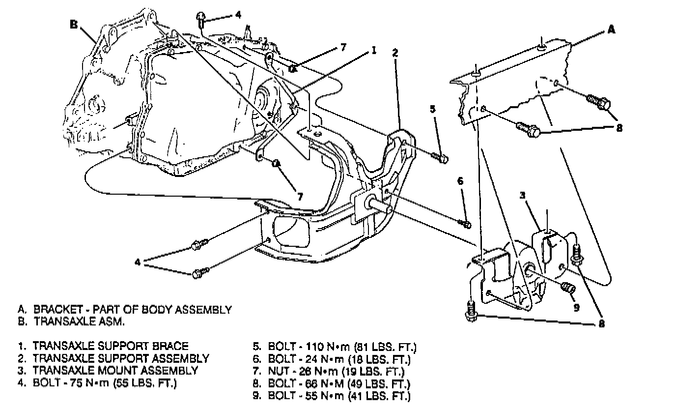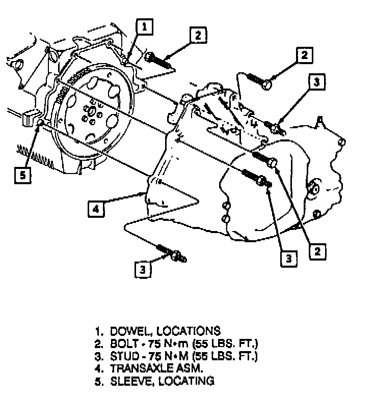 3. Lower engine to transaxle bolts. Remove transaxle jack.