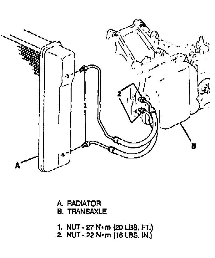 ^ Transaxle cooler and lines should be flushed with J 35944 or equivalent whenever the transaxle has been removed for overhaul or replacement or the torque converter, pump or case.