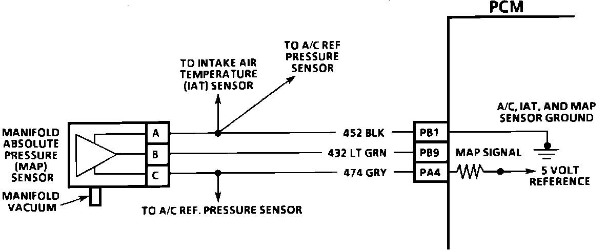 The PCM supplies 5 volts to the MAP sensor and monitors the voltage on a signal line to determine the manifold pressure. The sensor provides a path to ground through its variable resistor.