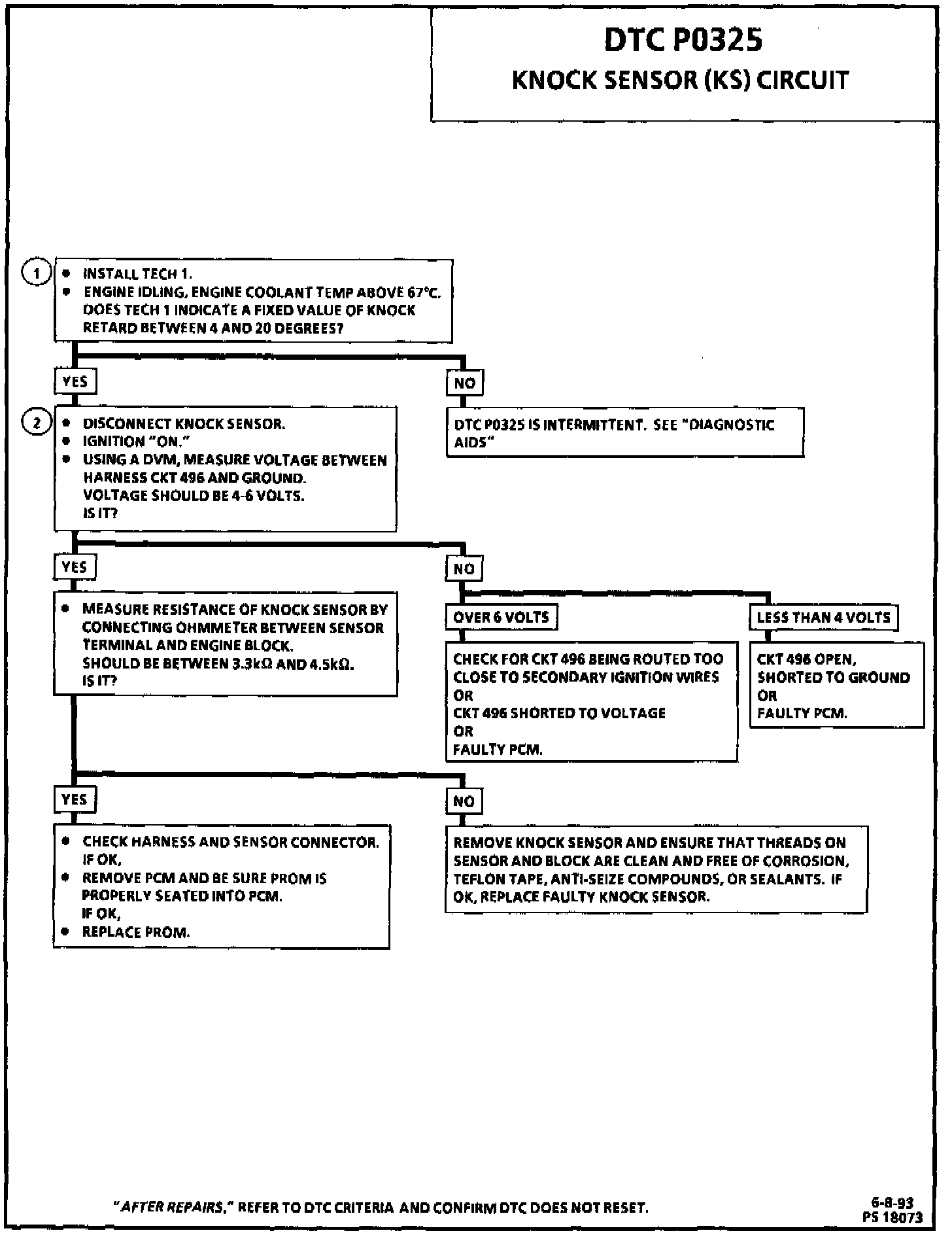 1. If the conditions for DTC P0325, as described above, are being met, the Tech 1 scan tool will always indicate "Yes" when the knock signal position is selected. If an audible knock is heard from the engine, repair the internal engine problem, as normally no knock should be detected at idle.