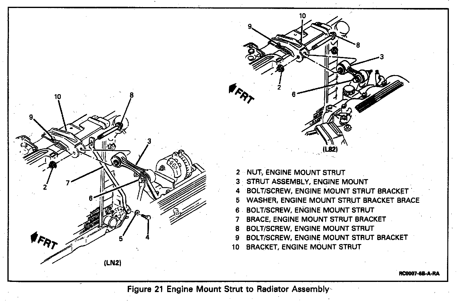 10. Engine mount strut from radiator upper mounting panel.