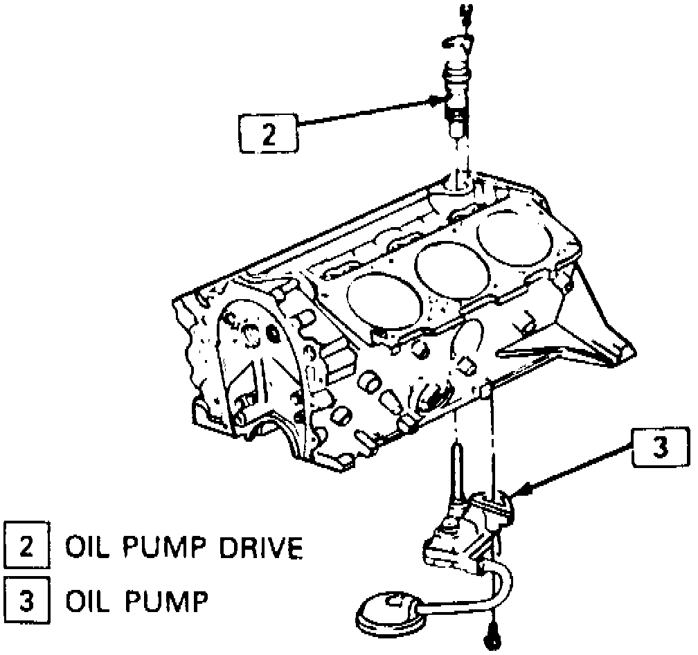1. Assemble pump and extension shaft with retainer to rear main bearing cap, aligning extension shaft with drive gear.