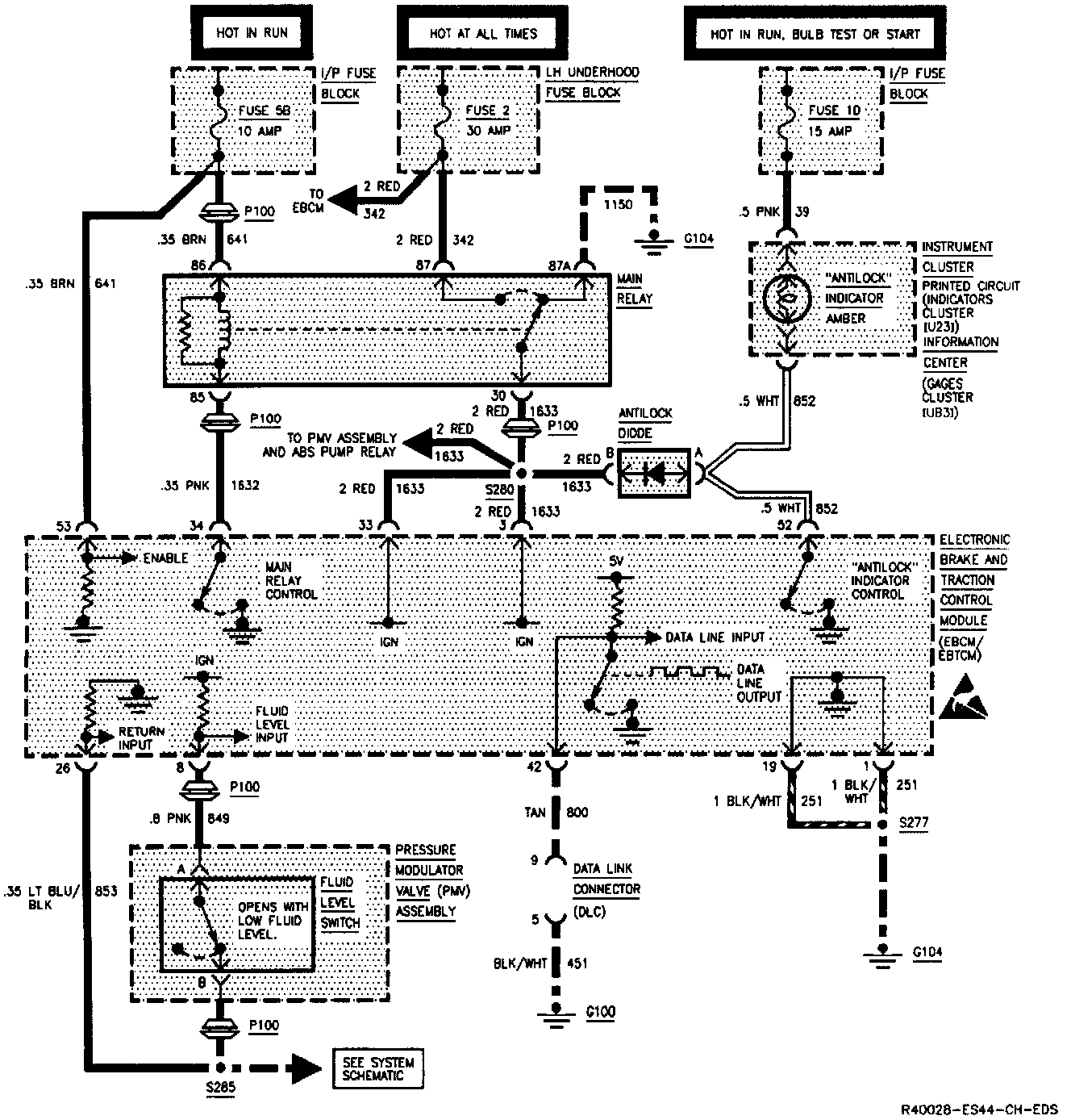 ^ When a low fluid condition exists, the EBCM/EBTCM turns on the amber ANTILOCK indicator but does not set a code. A low fluid level condition usually lights the red BRAKE indicator since the master cylinder supplies the PMV reservoir. However, restrictions or air in the hose could cause a low fluid condition in the PMV reservoir without lighting the red BRAKE indicator.