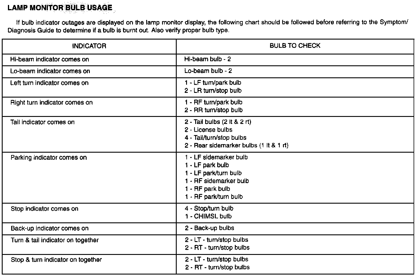 If bulb indicator outages are displayed on the lamp monitor display, the following chart should be followed before referring to Symptom/Diagnosis guide to determine if a bulb is burnt out. Also verify proper bulb type. Symptom/Diagnosis Guide