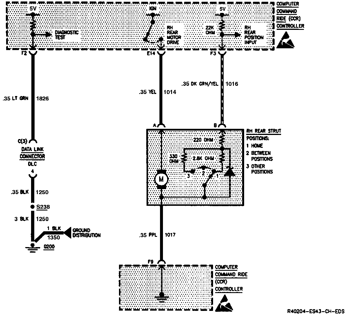 The computer command ride (CCR) controller changes strut firmness by applying voltage to the strut motors. The strut motors are grounded by the CCR controller. The CCR controller monitors the movement and the position of the RH rear strut at terminal F3.