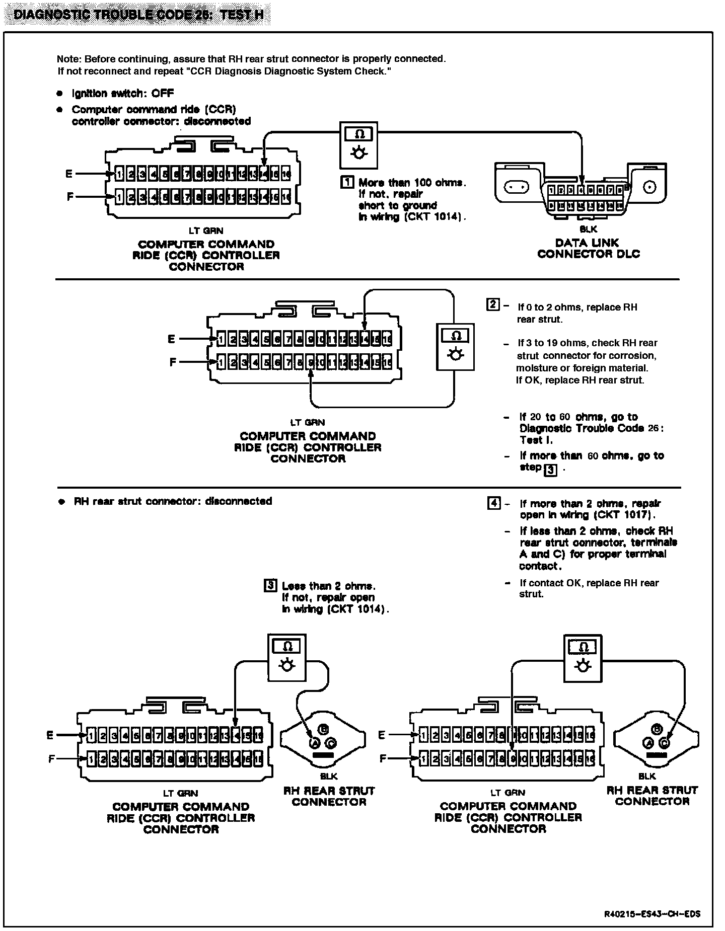 If the CCR controller detects that the strut position has not changed within 6 seconds of commanding a position, or that the strut is in the wrong position, it sets diagnostic trouble code 26. When diagnostic trouble code 26 is set, the system continues to operate, but the RH rear strut is disabled and the fault indictor turns ON.