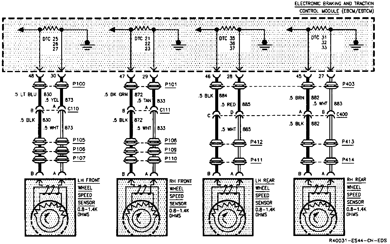 ^ Any condition which would result in lack of continuity in a wheel speed sensor circuit could result in DTC 21 or 25 (front) or 31 or 35 (rear) being set. These conditions include an open, a short to ground, or a short between the two wheel speed sensor circuits in the wiring harness between the speed sensor and EBCM/EBTCM. Also, an open or short to ground across the wheel speed sensor coil could trigger this diagnostic trouble code.