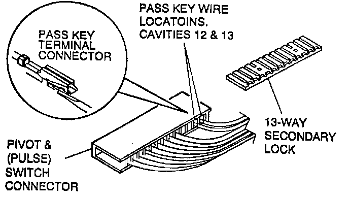 b. Install two terminals of pass key wire harness to cavities 12 and 13 of pivot & pulse switch connector. Cavity position is optional.
