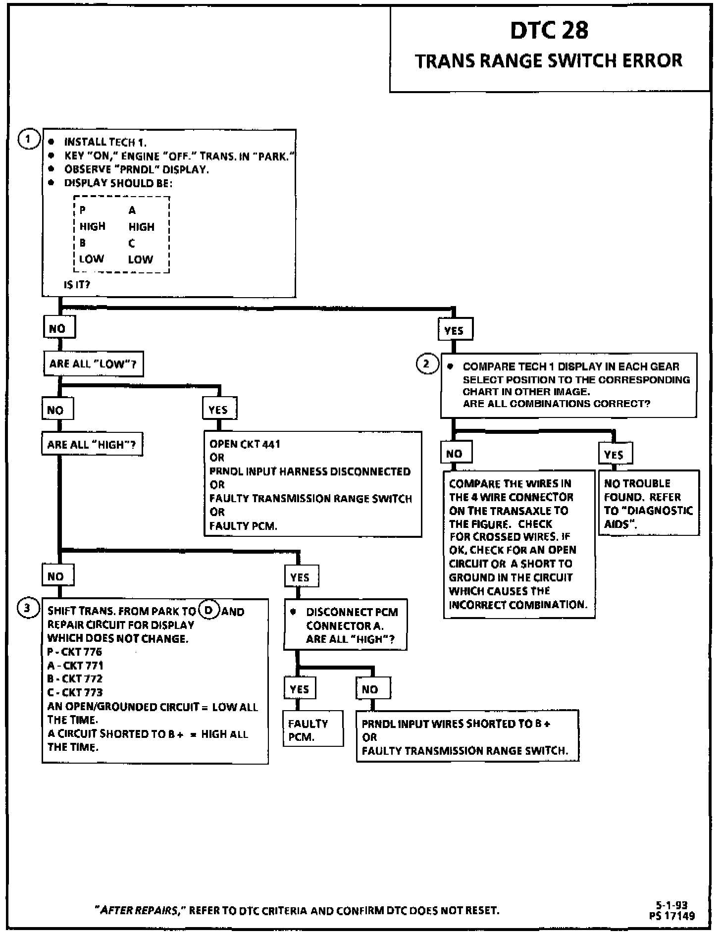 DTC 28 Will Set When: The PCM indicates an incorrect combination of lows and highs from the transaxle range switch input for more than 10 seconds.