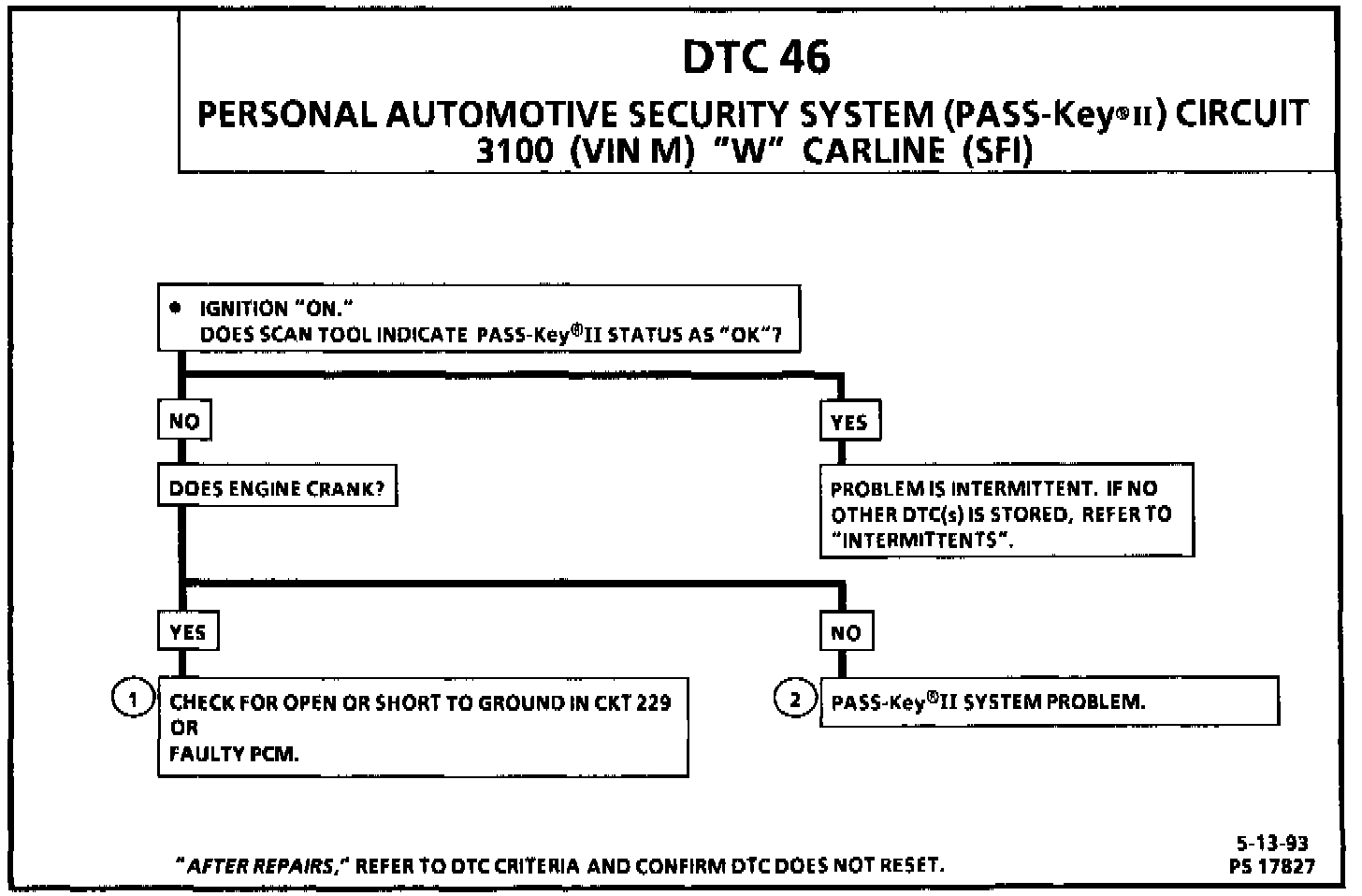 2. If DTC 46 is stored, and the engine will not crank, it indicates that there is a PASS-Key II problem or an incorrect key or starting procedure is being used.
