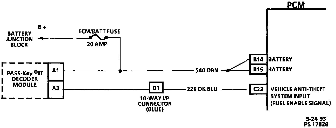 The PASS-Key II system is designed to disable vehicle operation if the incorrect key or starting procedure is used. The PASS-Key II decoder module sends a signal to the PCM if the correct key is being used. If the proper signal does not reach the PCM on CKT 229, the PCM will not pulse the injectors "ON" and thus not allow the vehicle to be started.
