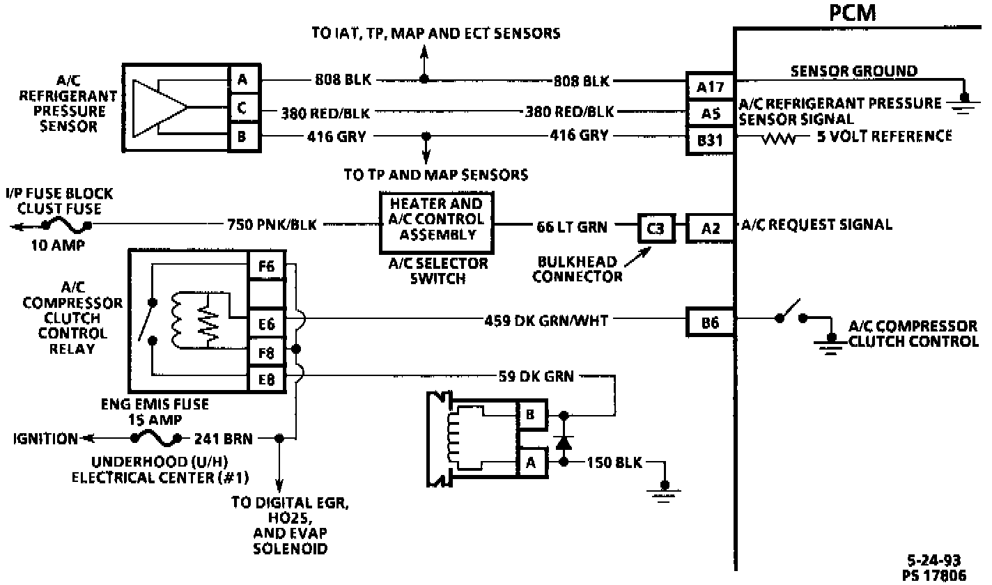 The A/C refrigerant pressure sensor is located in the high side of the A/C cooling system and signals the PCM of refrigerant pressure changes. This input indicates how much load the A/C compressor is putting on the engine. The PCM uses this input to determine IAC valve position for idle speed control. This 3 wire sensor has a 5 volt reference input, a signal line and a ground