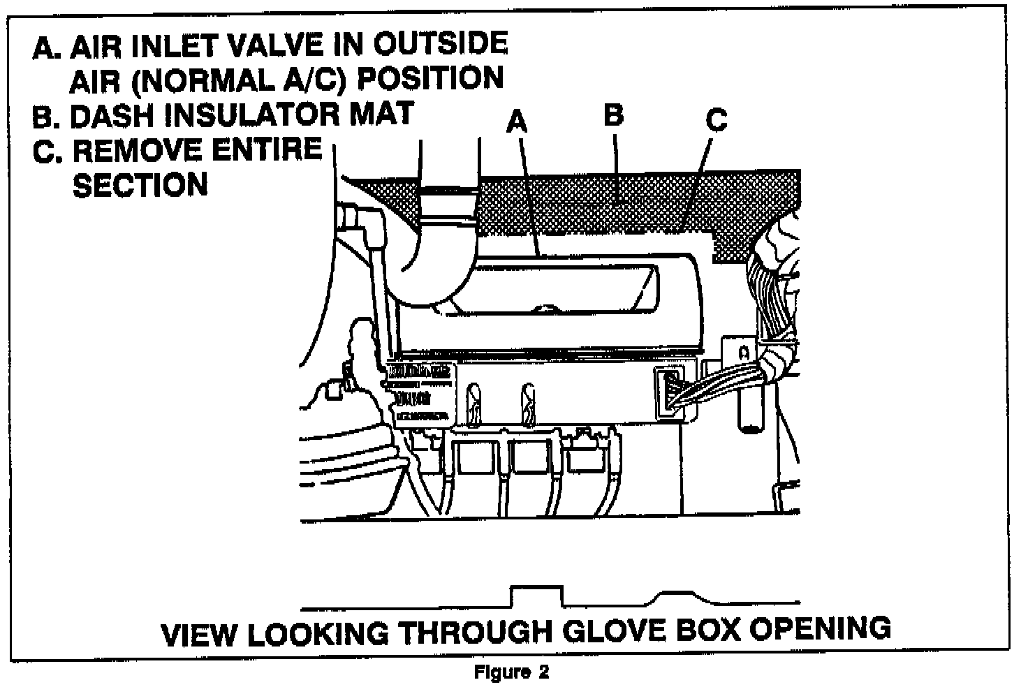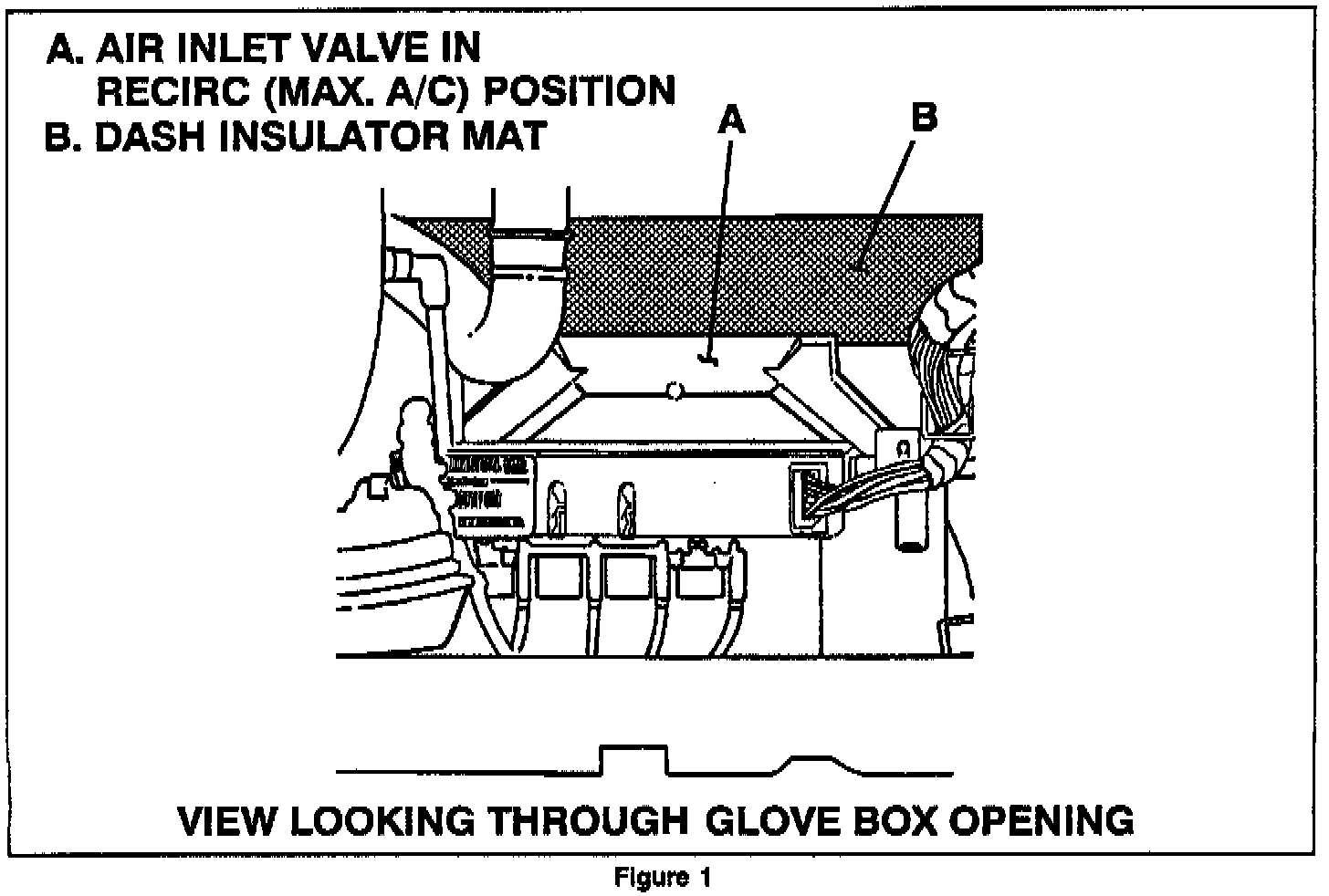 The dash insulator mat can interfere with the air inlet valve (sometimes referred to as the A/C "recirc" door). This can cause the valve to be stuck in the max (recirc) position causing inside air to be recirculated. See Figure 1.