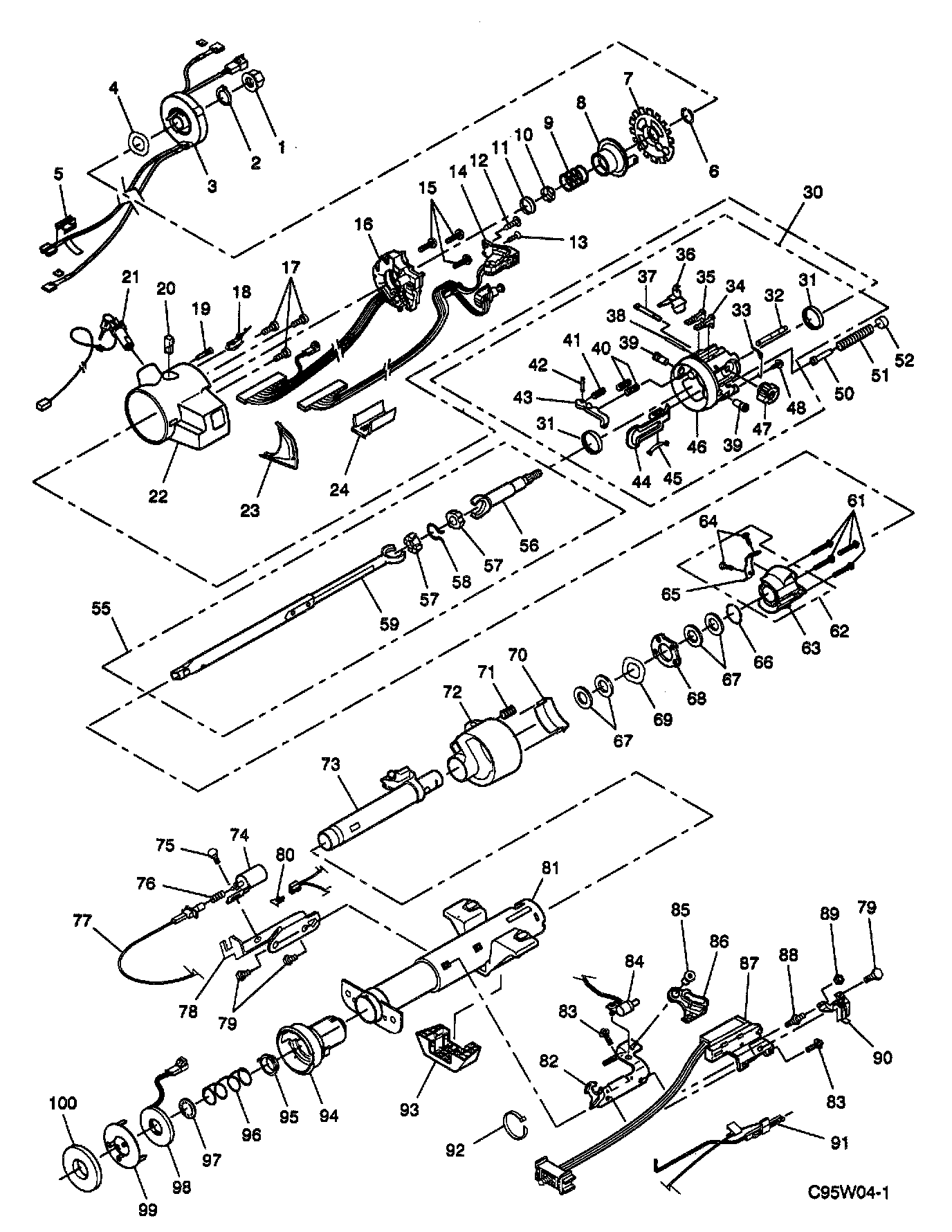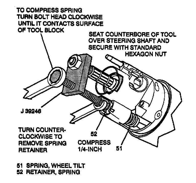 - Spring retainer (52) must be compressed approximately 1/4 inch into steering column housing (46).