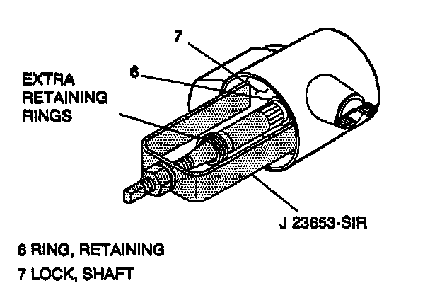 6. Shaft lock retaining ring (6) using J 23653 SIR to push down shaft lock (7).