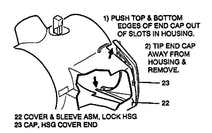 - Using fingers pry up and out at location shown. Tilt end cap away from lock housing cover and sleeve assembly (22) and remove (see figure 6).