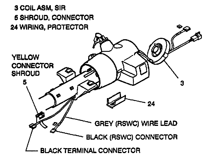 Important: Before doing any service procedures, disabling the SIR system and removal of Inflator Module and Steering Wheel is needed. Columns equipped with Supplemental Inflatable Restraint (SIR) and Redundant Steering Wheel Control (RSWC) will have Inflatable Restraint coils with two wire leads. SIR wire leads are yellow with a yellow connector shroud. RSWC wire leads are grey with black connectors.