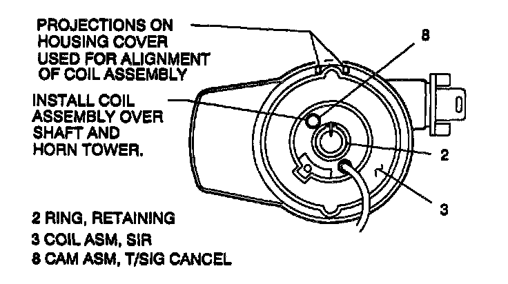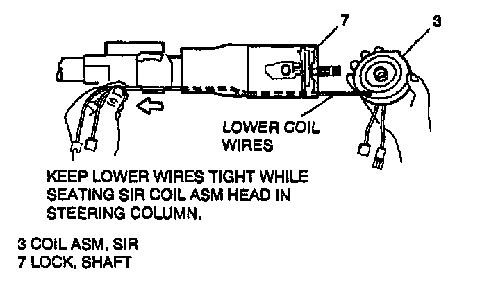 Notice: SIR coil assembly (3) wires must be kept tight with no slack while installing SIR coil assembly. Failure to do so may cause wires to be kinked near shaft lock area and cut when steering wheel is turned.
