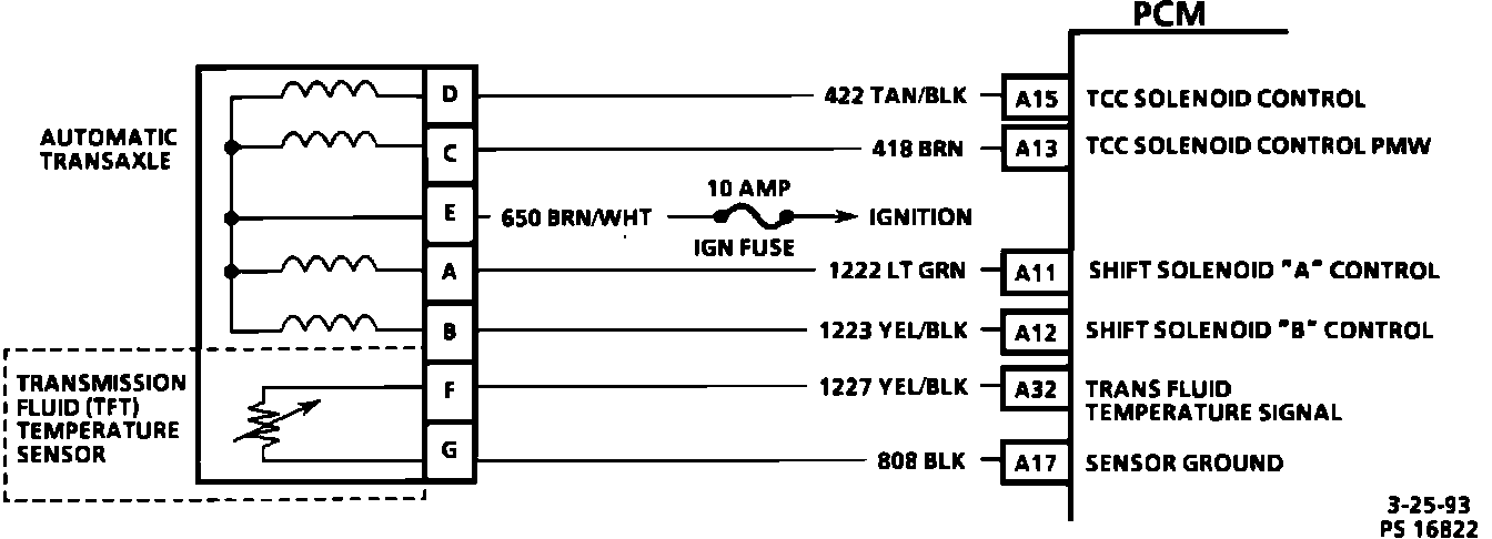 The PCM controls automatic transmission shift points by use of solenoid operated fluid valves inside the transaxle. The solenoids get power when the ignition is "ON", and become energized when the PCM completes the circuit to ground.