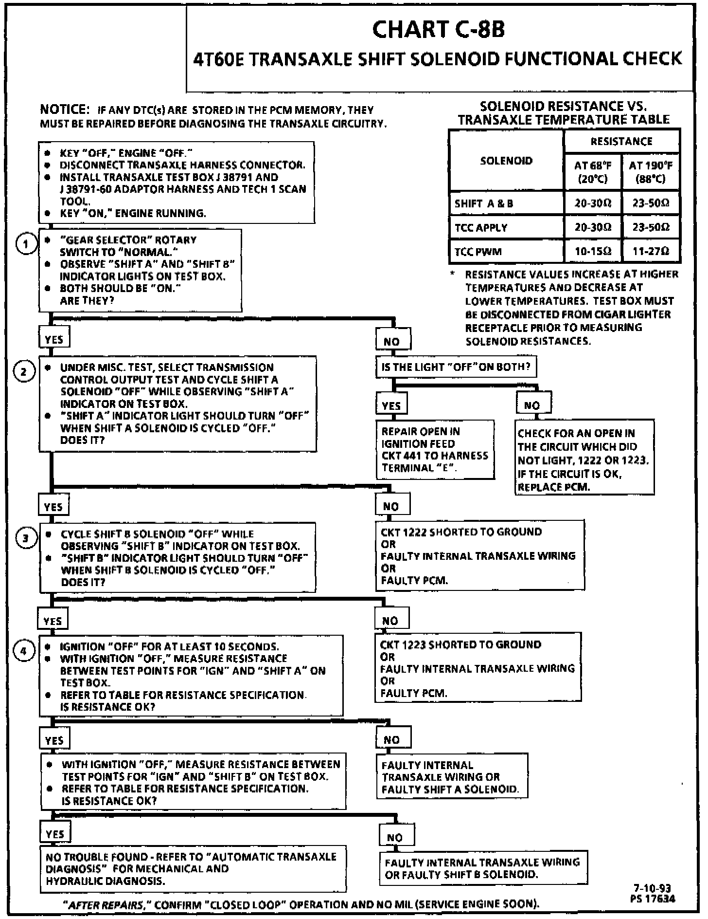 4. Determines if shift solenoid "A" and shift solenoid "B" resistance values are within range specifications in chart.