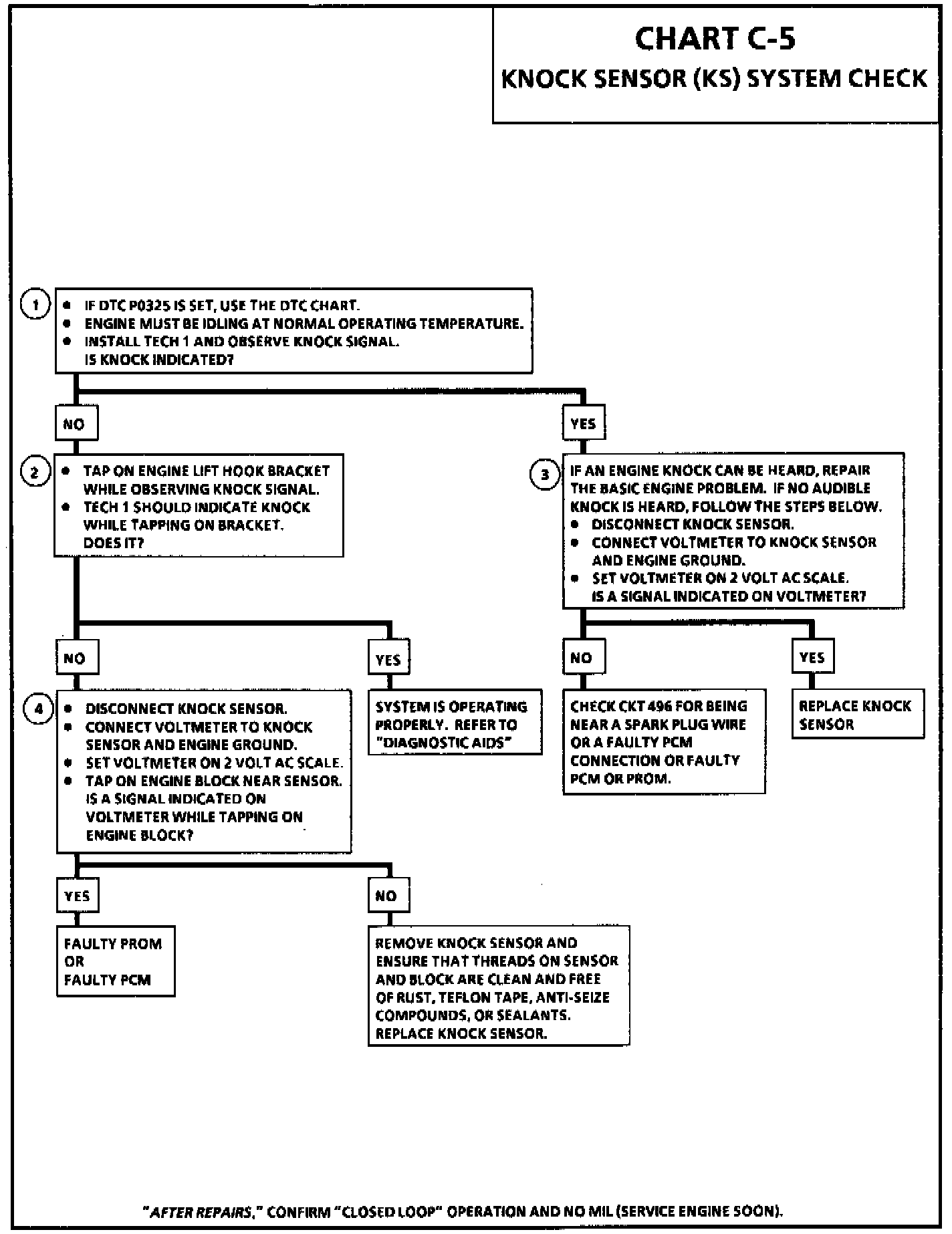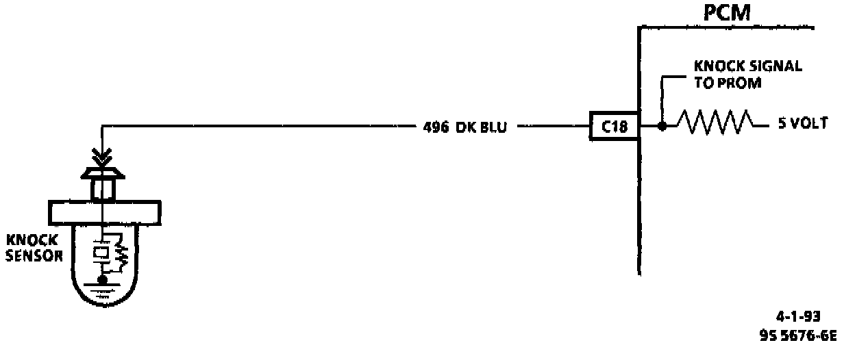 The knock sensor is used to detect engine detonation and allow the PCM to retard the ignition control timing based on the signal being received. The circuitry within the knock sensor causes the PCM supplied 5 volts signal to be pulled down so that under a no knock condition CKT 496 measures about 2.5 volts. The knock sensor produces an AC signal which rides on the 2.5 volts DC voltage. The amplitude and frequency are dependent upon the knock level.