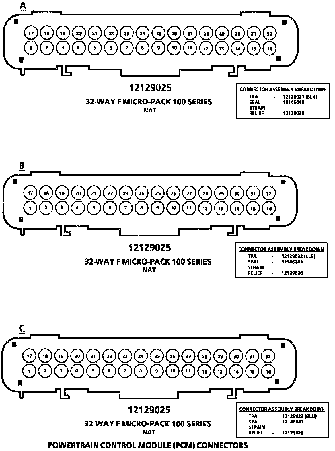 Powertrain Control Module (PCM) Connectors: A, B & C: