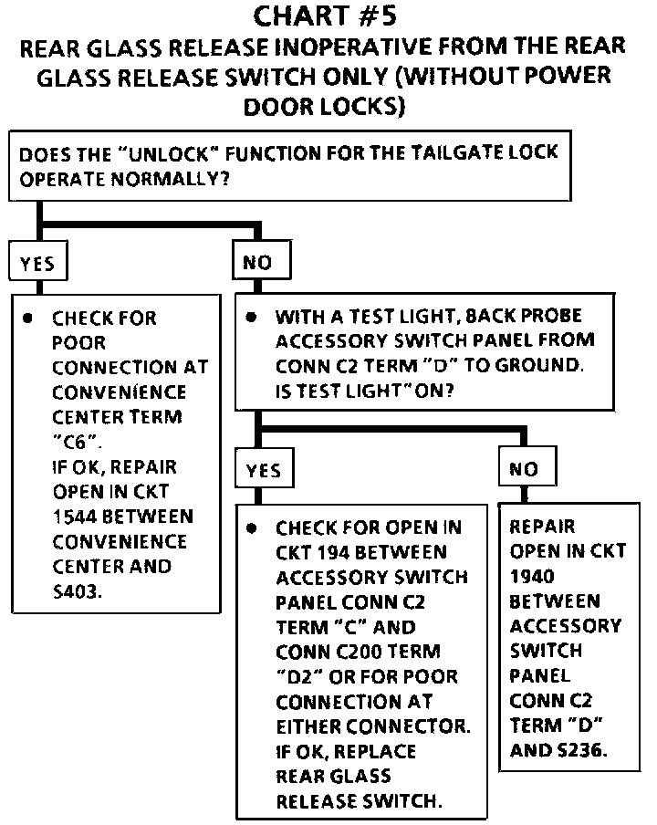 Chart #5 Rear Glass Release Inoperative From The Rear Glass Release SW Only (Without Power Door Locks):