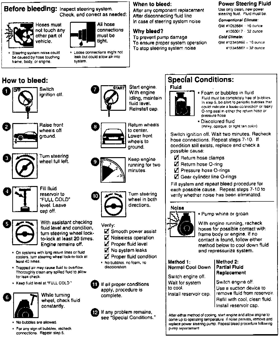 Bleed power steering system after any component replacement, disconnecting fluid line or in case of steering system noise. Bleed system to prevent pump damage, stop steering noise and to ensure proper system operation. Before bleeding, inspect steering system. Check and correct if needed power steering lines touching frame body or engine. Also check all hose connections for looseness or leaks and tighten.