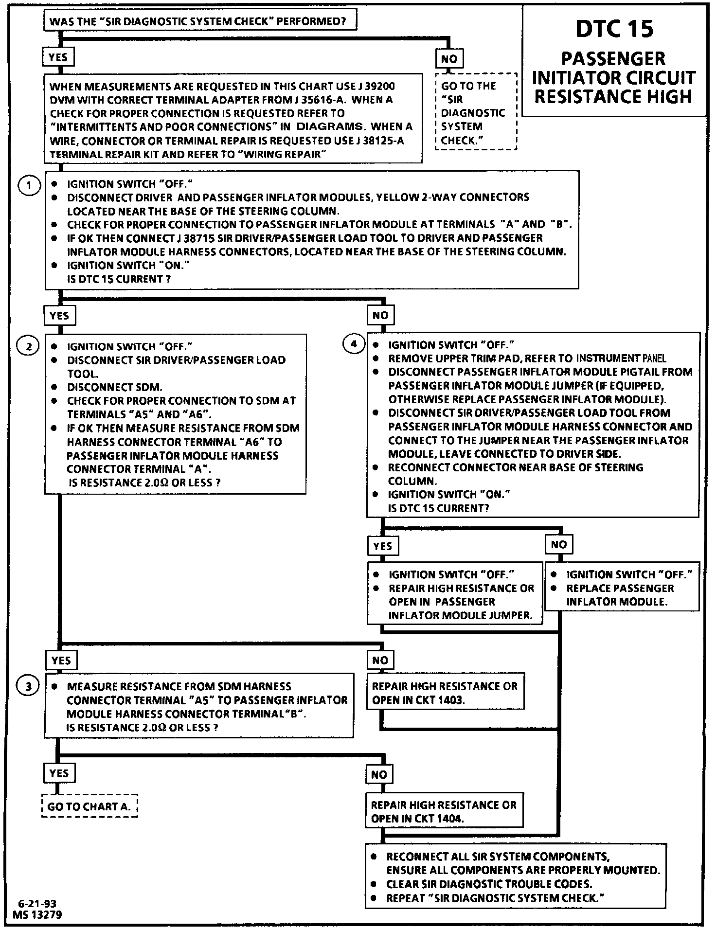 When the ignition switch is turned "ON the SDM will perform tests to diagnose critical malfunctions within itself. Upon passing these tests "Ignition 1", 36 VLR, and deployment loop voltages are measured to ensure they are within their respective normal voltage ranges. The SDM then proceeds with the "Current Source Diagnostics." "Passenger Side Low" terminal "A5" is grounded through a resistor and the passenger current source connected to "Passenger Side High" terminal "A6" allows a known amount of current to flow. By monitoring the voltage difference between "Passenger Side High" and "Passenger Side Low" the SDM calculates the combined resistance of the passenger inflator module, harness wiring CKTs 1403 and 1404 and connector terminal contact.