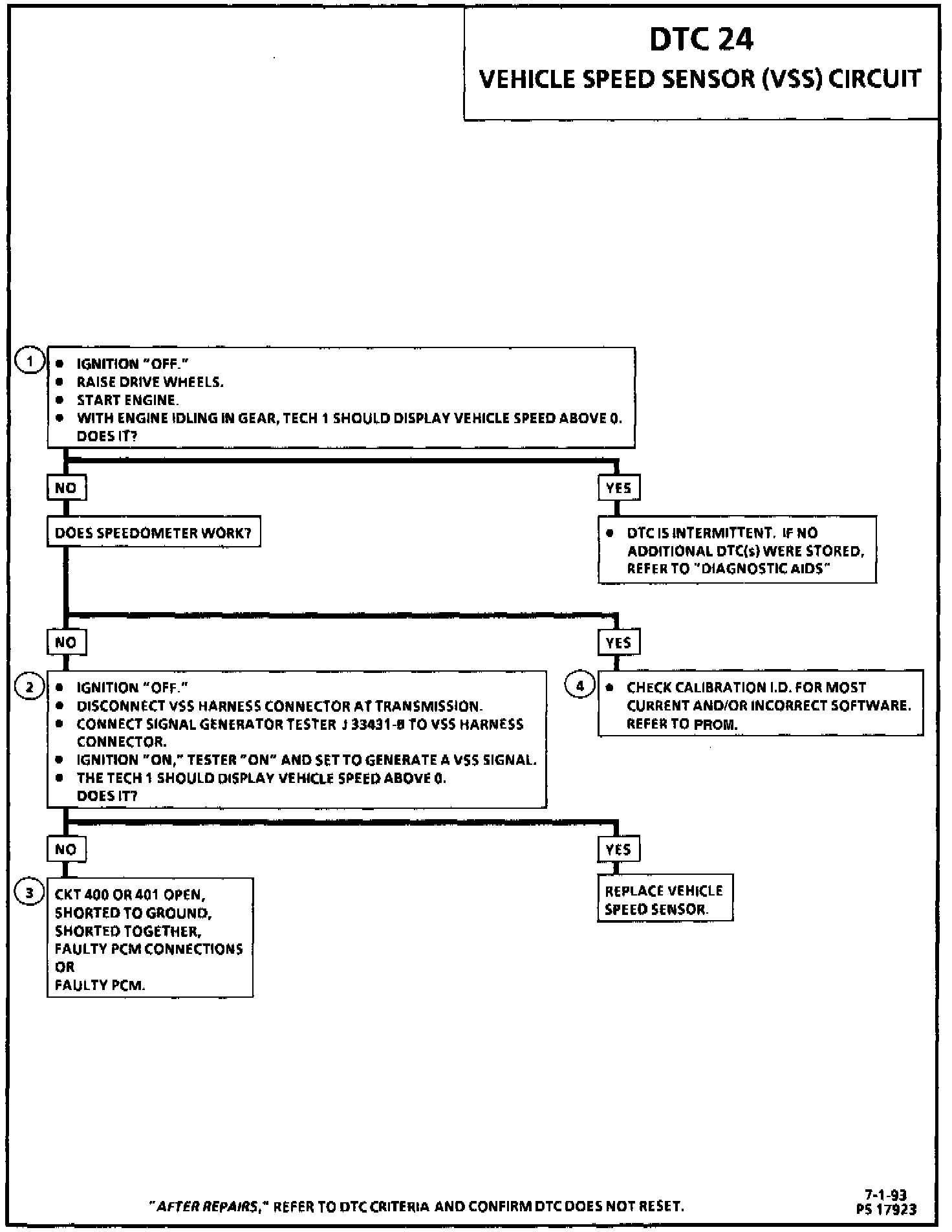 1. If vehicle speed is indicated at this point, DTC 24 is intermittent. Check harness routing and connections at VSS and the PCM.