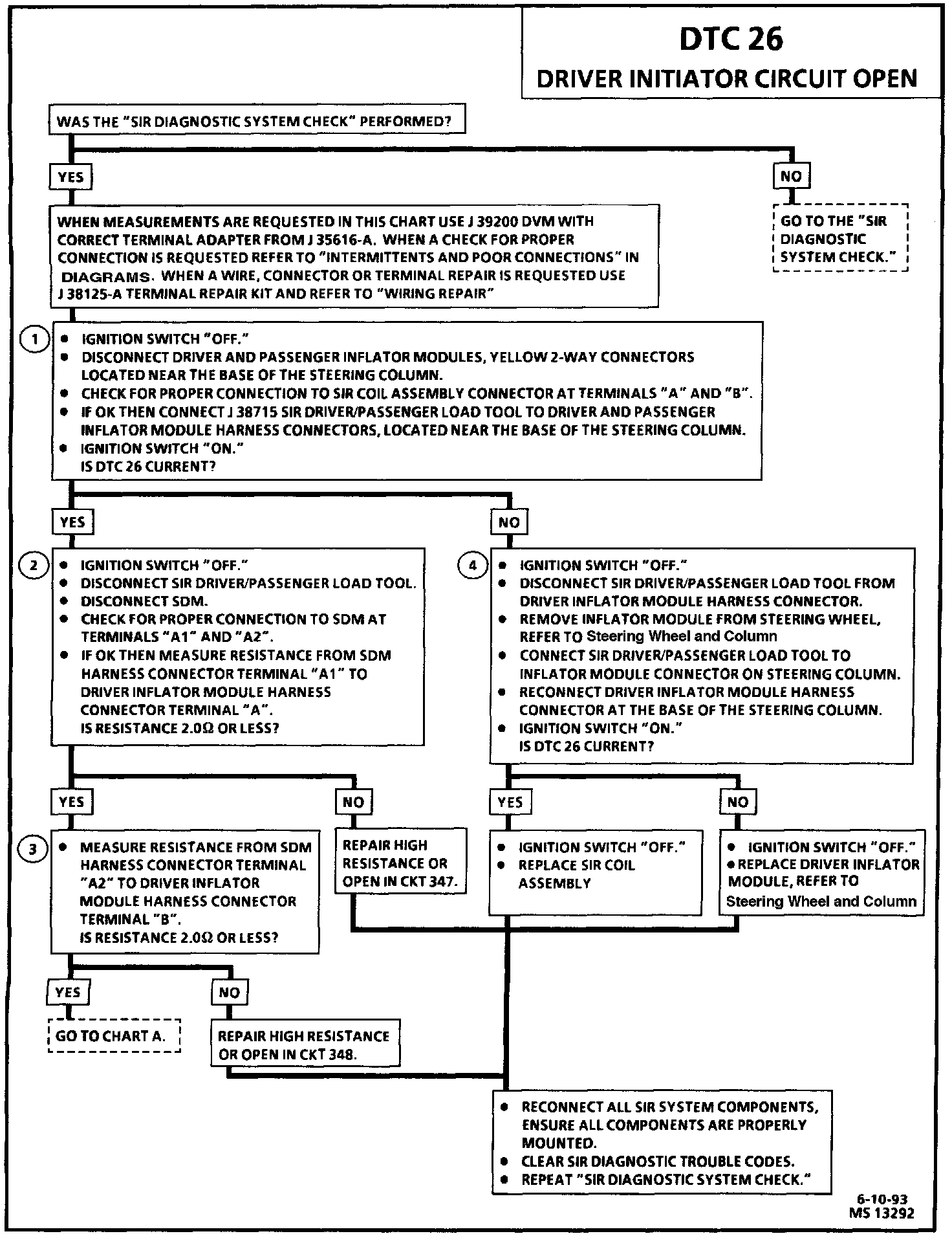 An intermittent condition is likely to be caused by a poor connection at the driver inflator module terminals "A" and "B", SIR coil assembly terminals "A" and "B", SDM terminals "A1" and "A2", or an open in CKT 347 or CKT 348.