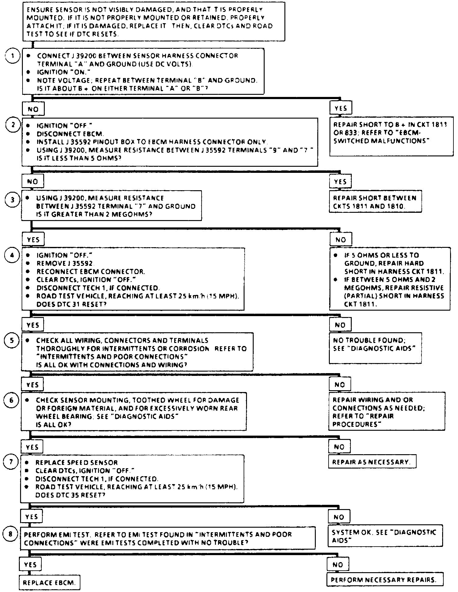 3. Checks for a short to ground in the speed sensor input circuit wire. The ground may be either a "hard" short to ground, or a resistive (partial) short. A short with a resistance less than 2 megohms, though not a "hard" short, can still cause DTC 35 to set.