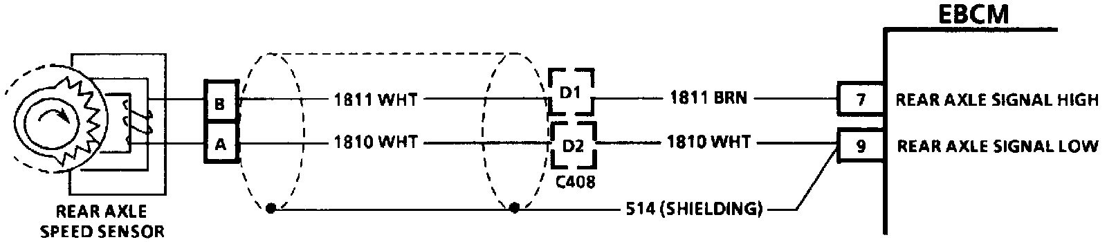 ^ The rear axle speed sensor is located in the rear axle housing. In order to prevent electromagnetic interference from disturbing the speed sensor signal, the sensor wires are twisted together 9 times for every foot of wire.