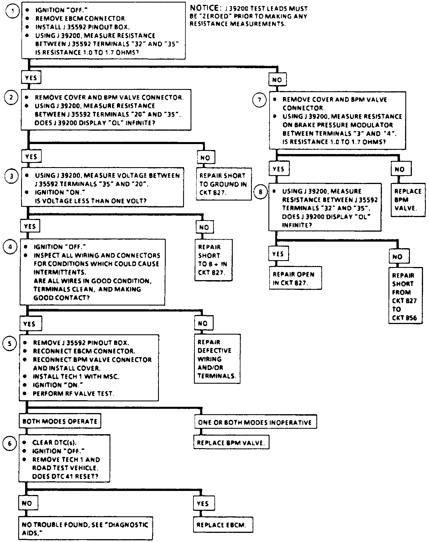 The expected position of the right front valve solenoid does not match the commanded position from the EBCM (if valve line voltage does not match expected value). Conditions which could cause DTC 41 to set are damage to the right front solenoid, an open or short to ground or battery voltage on CKT 827.