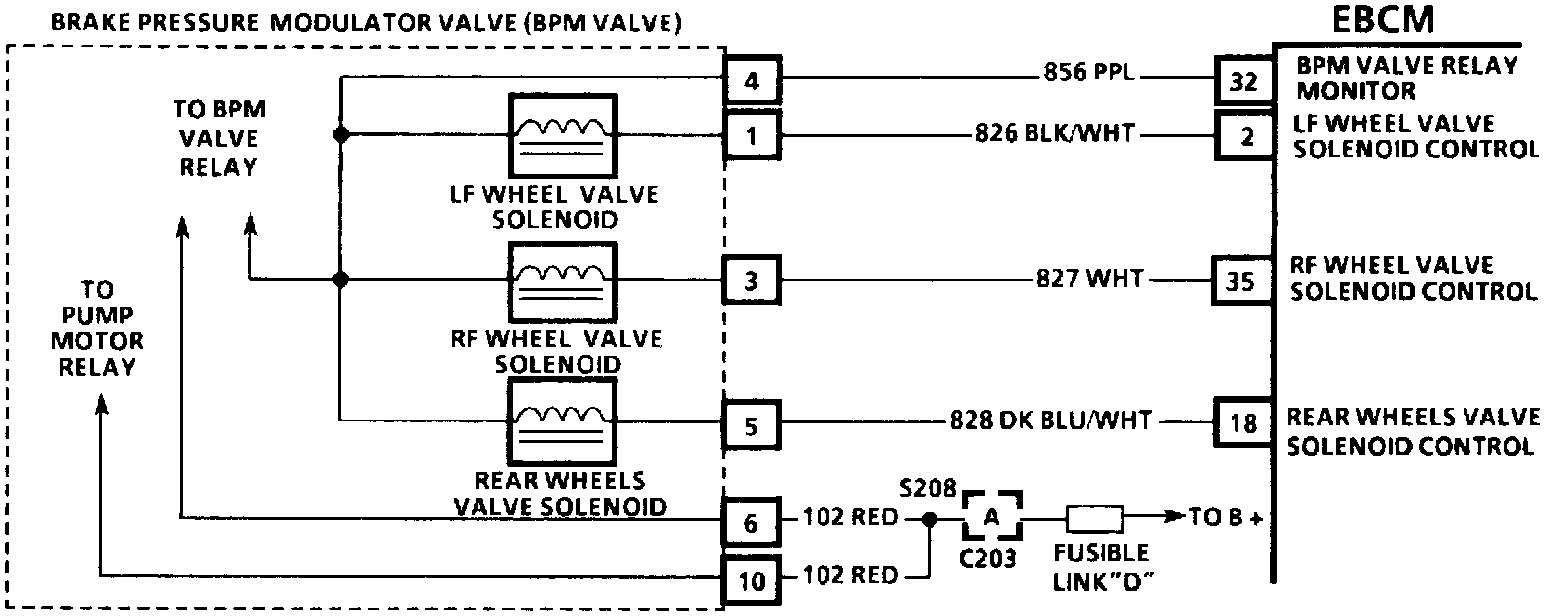 With the ignition in "Run," "Bulb Test" or "Start," the EBCM applies voltage to the coil of the BPM valve relay. The EBCM will complete an internal self-check before providing ground to the coil. Once energized, the relay will provide B+ to the valve solenoids.
