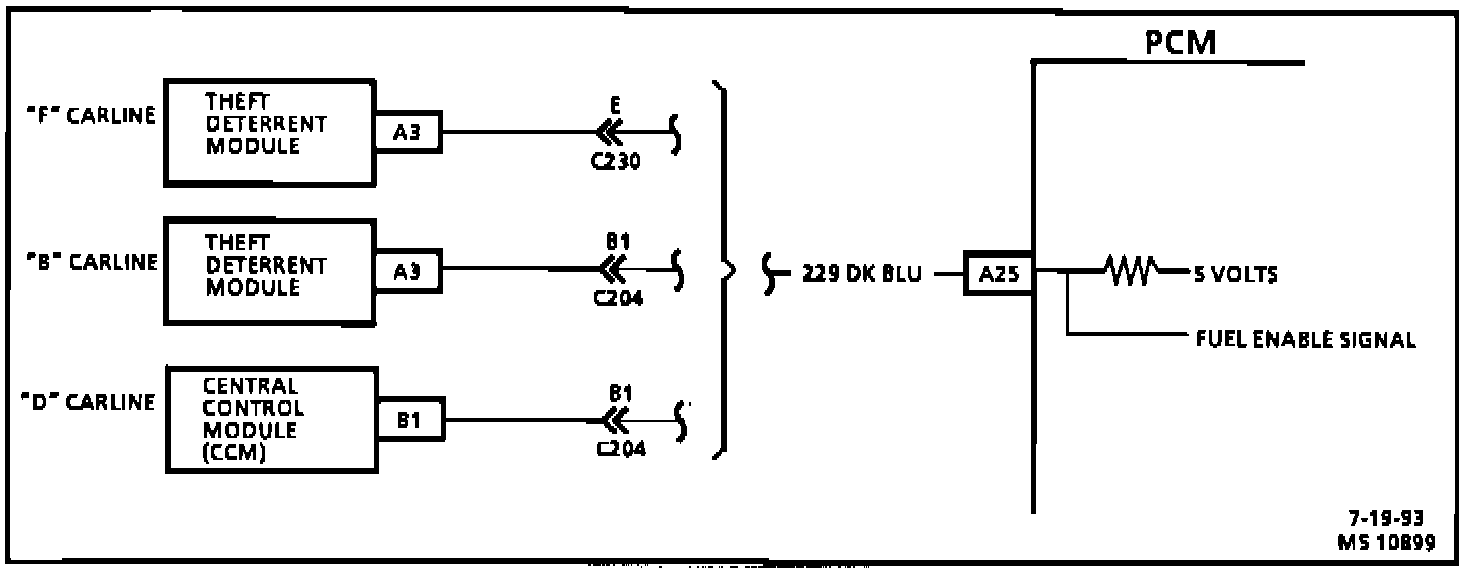 The PASS-Key II system is designed to disable vehicle operation if the incorrect key or starting procedure is used. The theft deterrent module/Central Control Module (CCM) enables the crank circuit to the starter and sends a signal to the PCM if the correct key is being used If the proper signal does not reach the PCM on CKT 229, the Powertrain Control Module (PCM) will not pulse the injectors "ON" and thus not allow the vehicle to continue to run, even if the crank circuit is bypassed. The proper signal CKT 229 is between 40-60 Hz and is measured using the DC scale on the Digital Volt Ohm Meter (DVOM).