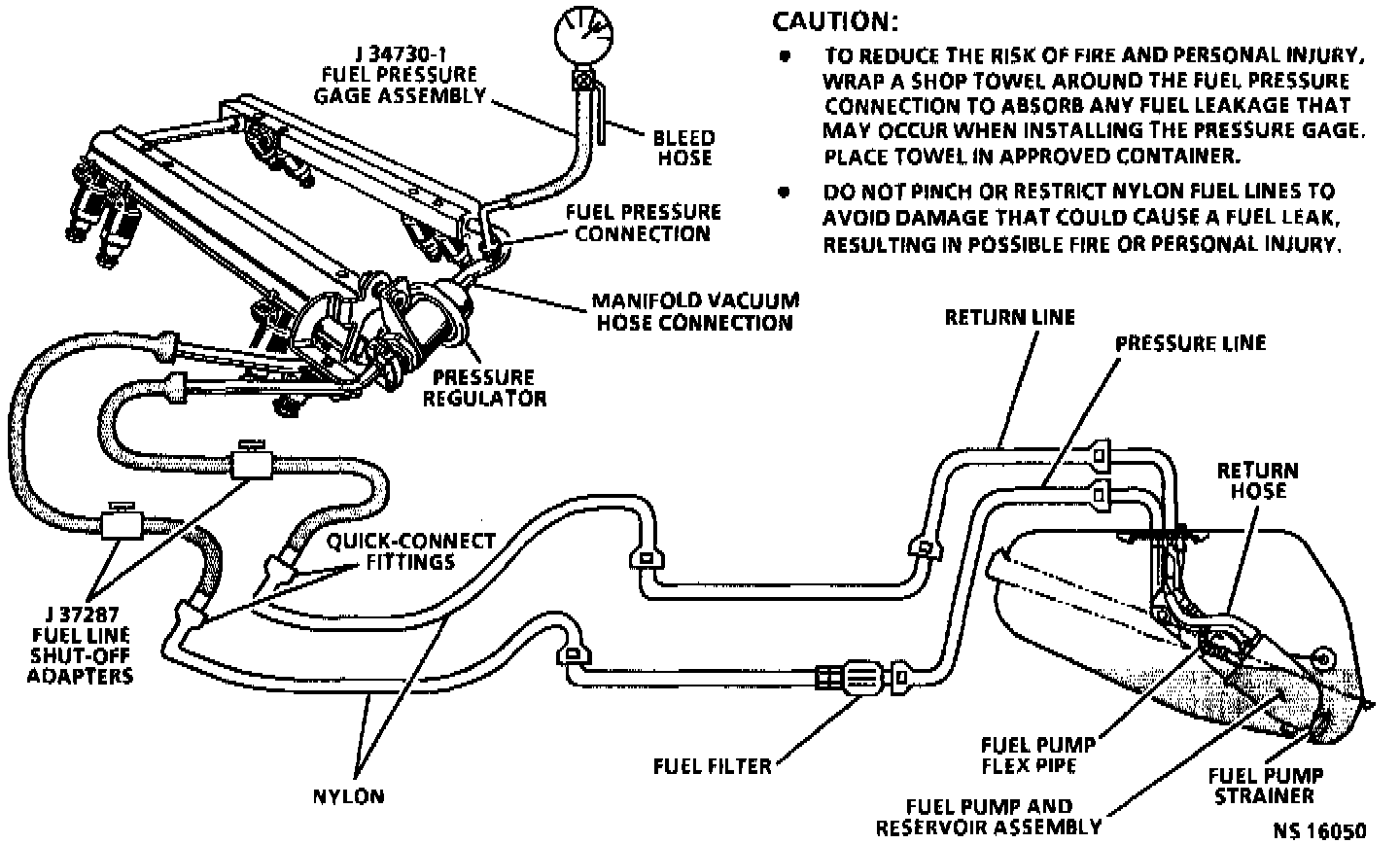 2. Restricting the fuel return line allows the fuel pressure to build above regulated pressure. With a Tech 1 (or equivalent) Scanner enable the fuel pump, pressure should rise above 325 kPa (47 psi) as the valve in the return line is partially closed.
