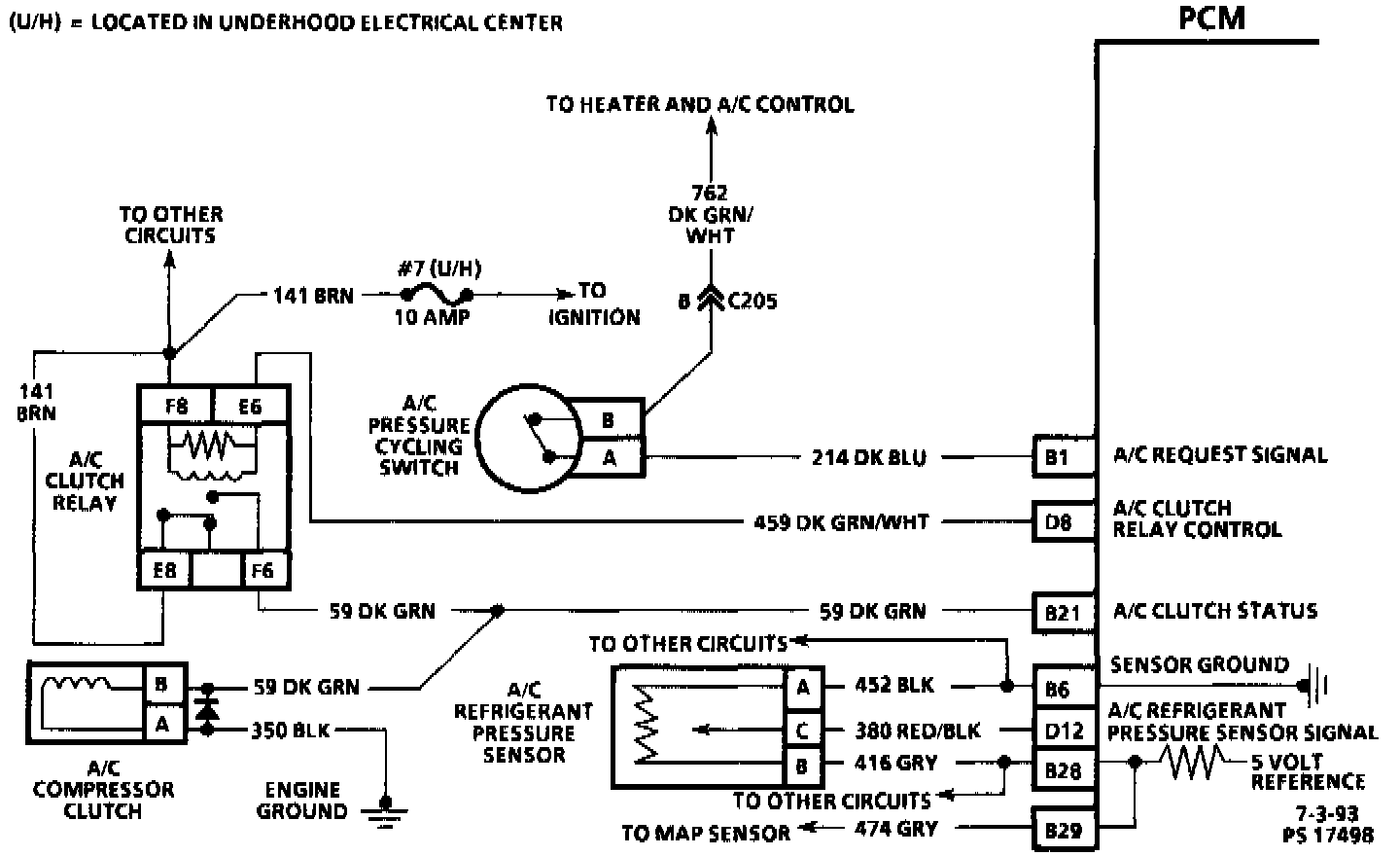 When the Powertrain Control Module (PCM) detects that A/C has been requested, the PCM will activate the A/C clutch relay. When the relay has been activated, voltage should be present at both the A/C compressor clutch and the A/C clutch status line terminal of the PCM.