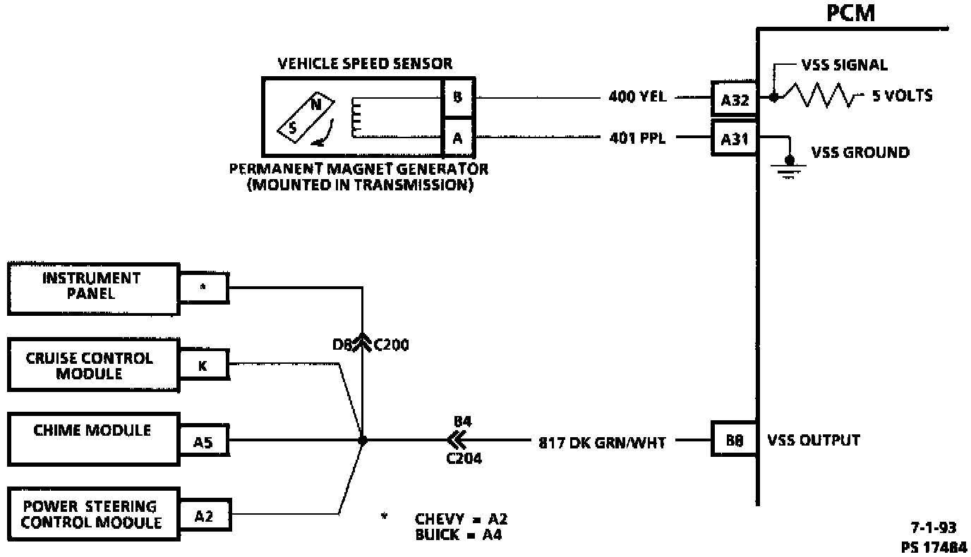 The Powertrain Control Module (PCM) receives the vehicle speed sensor signal on CKT 400. The PCM processes this signal and sends it to the various components which use vehicle speed data through CKT 817.