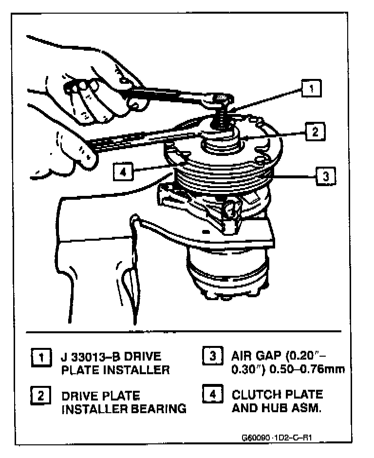 6. Hold the center screw with a wrench. Tighten the hex portion of the installer-remover J 33013-B body to press the hub onto the shaft. Tighten the body several turns, remove the installer and check to see that the shaft key is still in place in the keyway before installing the clutch plate and hub assembly to its final position. The air gap between frictional surfaces of the clutch plate and clutch rotor should be 0.50-0.76mm (0.020-0.030").