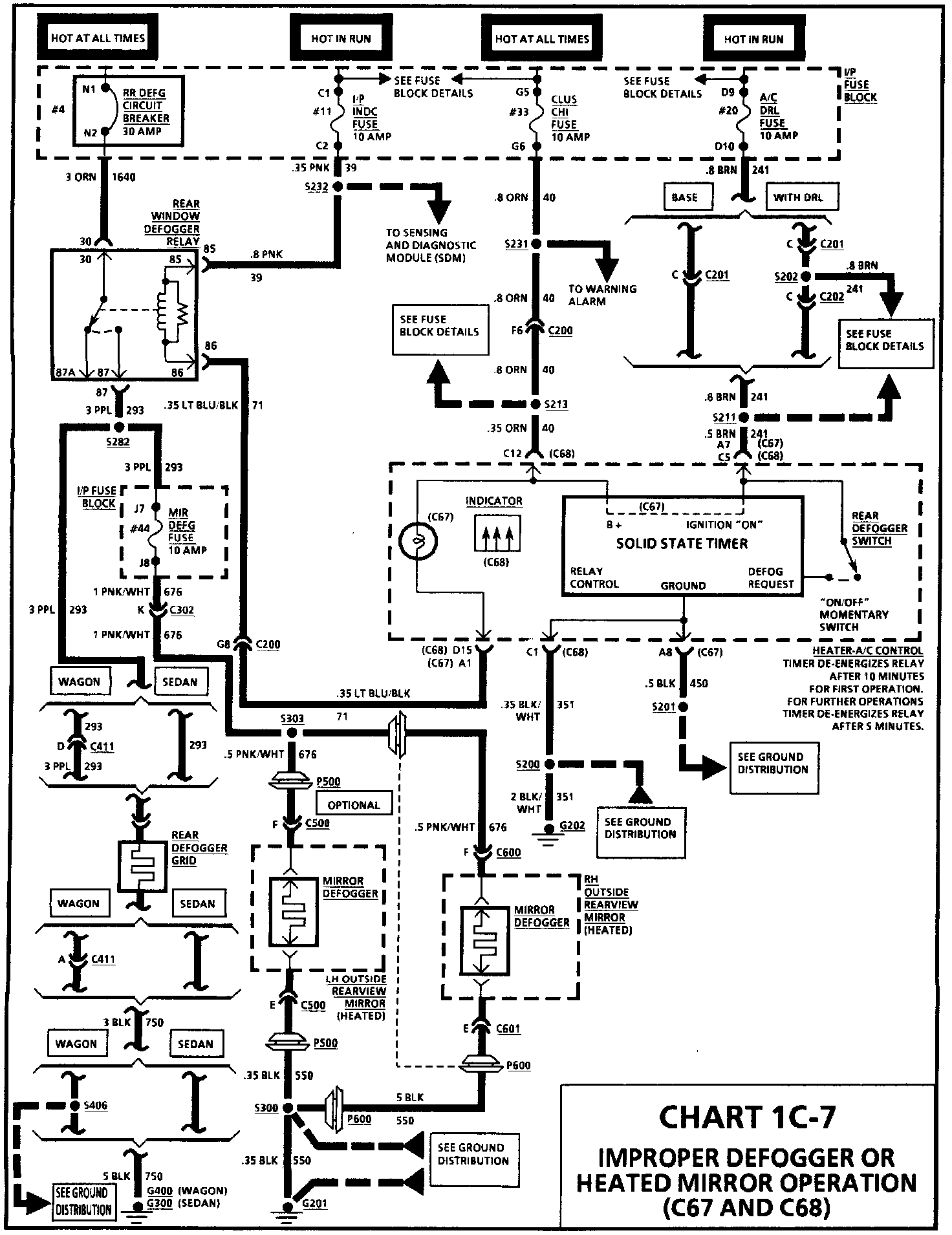 When the ignition switch is turned to "RUN," voltage is applied from I/P Fuse Block Fuses 33 (C68) and 20 to the H-A/C control. When the rear defogger switch is pressed to "ON," voltage is momentarily applied to the defog request input of the solid state timer. Once requested, the timer will close the internal contacts from terminal "D15" to terminal "C1," (C68) or terminal "A1" to terminal "A8" (C67) of the H-A/C control, lighting the "ON" indicator and energizing the coil of the rear defogger relay with voltage applied from I/P Fuse Block Fuse 11 and CKT 39. When the rear defogger relay contacts close, voltage is applied from I/P Fuse Block Circuit Breaker 4 and CKT 1640 to CKT 293, and I/P Fuse Block Fuse 44 to the heated mirrors.