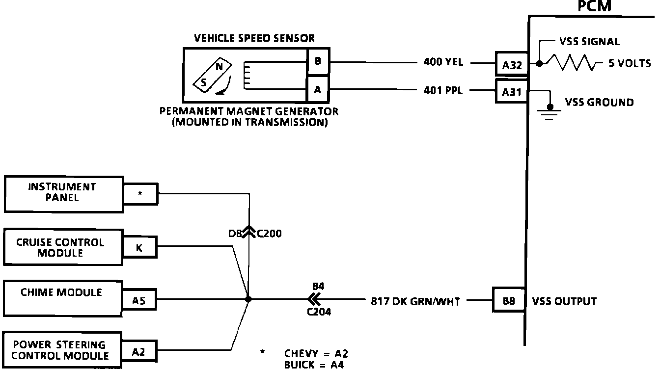 The VSS produces an A/C voltage signal that increases with vehicle speed. The PCM processes this signal and sends it to the instrument panel, Power Steering Control Module, chime module and cruise control module on CKT 817.