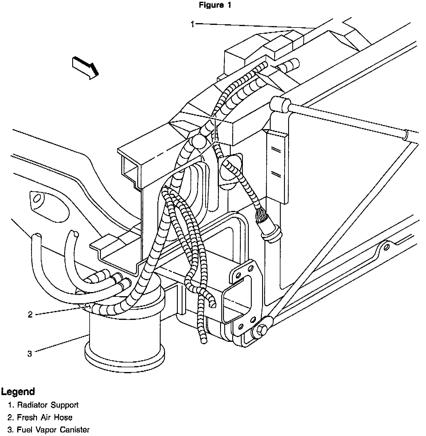 5. If the fresh air hose is located in the RH fender well, relocate it to the front radiator support area. See Figure 1.
