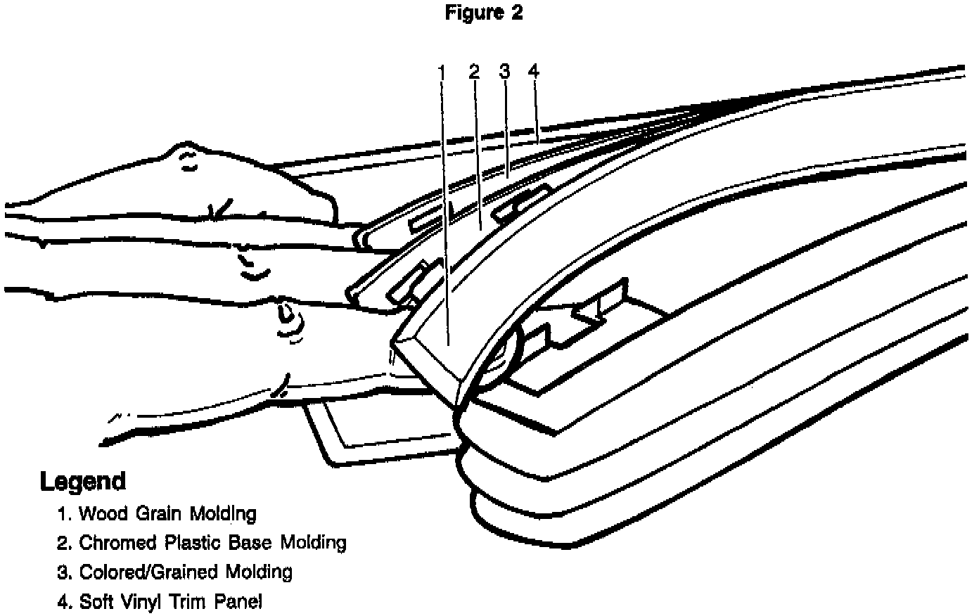 c. The colored/grained base molding and soft vinyl trim panel surface (Figure 2, Items 3 and 4).