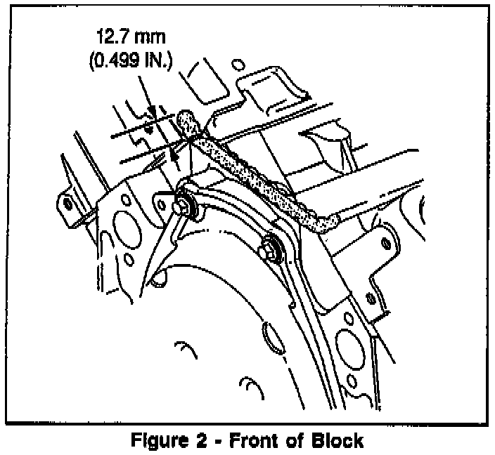 When installing the intake manifold, use a 5 mm (1/4 in.) thick bead of Wacker T-330 RTV, P/N 12346192, on the front and rear sealing areas between the engine block and intake manifold. See Figures 1 and 2. Wacker T-330 RTV has improved adhesive abilities, is oxygen sensor safe, and is noncorrosive to ferrous metals. Wacker T-330 RW cannot be used in coolant sealing surface areas.