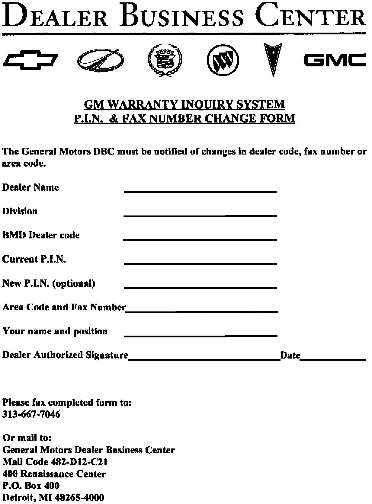 The PIN and Fax Number can be updated as needed by completing a "PIN & FAX NUMBER CHANGE FORM" and faxing or mailing it to the DBC. It is also recommended that dealers who were originally assigned PIN code "9999" complete this form to request a new dealer-selected PIN. Copies should be made locally from the form included in this bulletin.