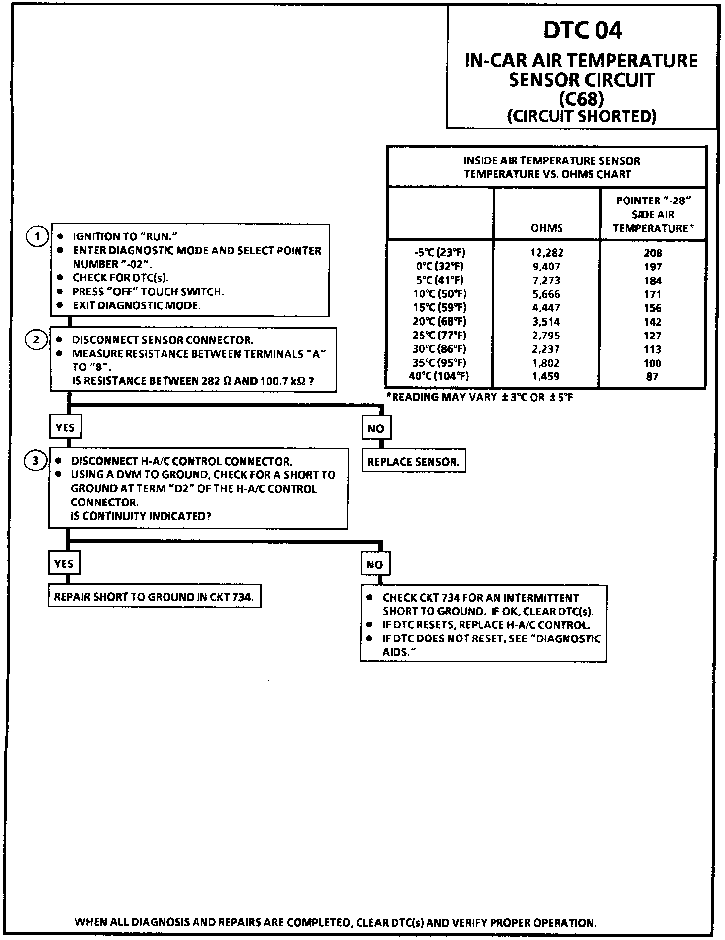 With ignition in "RUN," the H-A/C control will detect this fault anytime that CKT 734 stays at or near 0 volts.